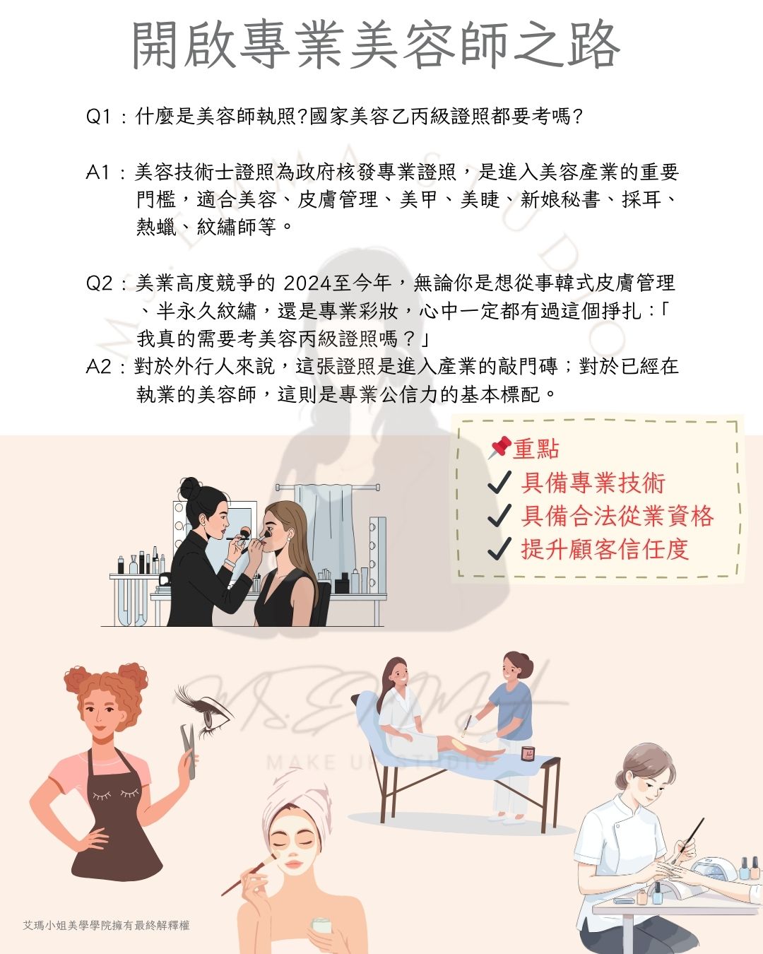 A1 : 美容技術士證照為政府核發專業證照,是進入美容產業的重要門檻,適合美容、皮膚管理、美甲、美睫、新娘秘書、採耳、 熱蠟、紋繡師等。