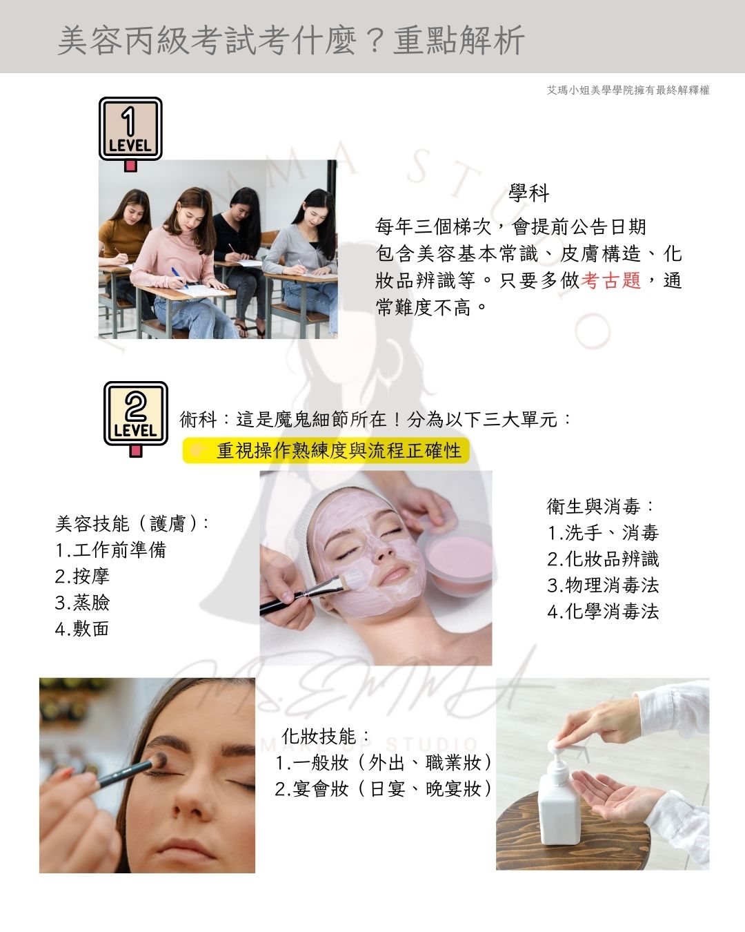 A : 學科:包含美容基本常識、皮膚構造、化妝品辨識等。只要多做考古題,通常難度不高。