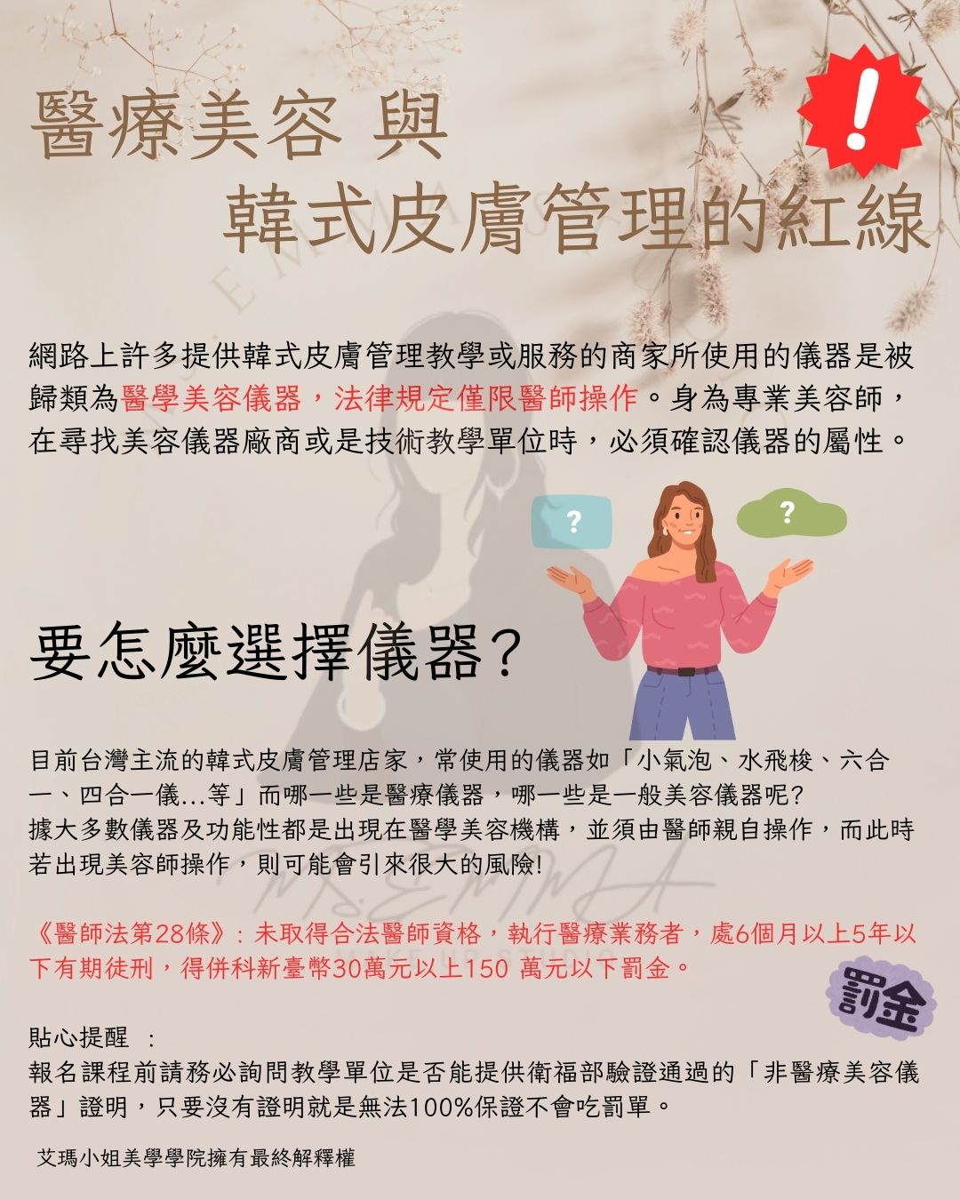 網路上許多提供韓式皮膚管理教學或服務的商家所使用的儀器是被歸類為醫學美容儀器,法律規定僅限醫師操作。