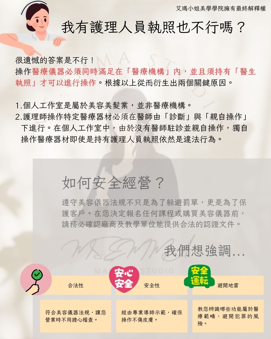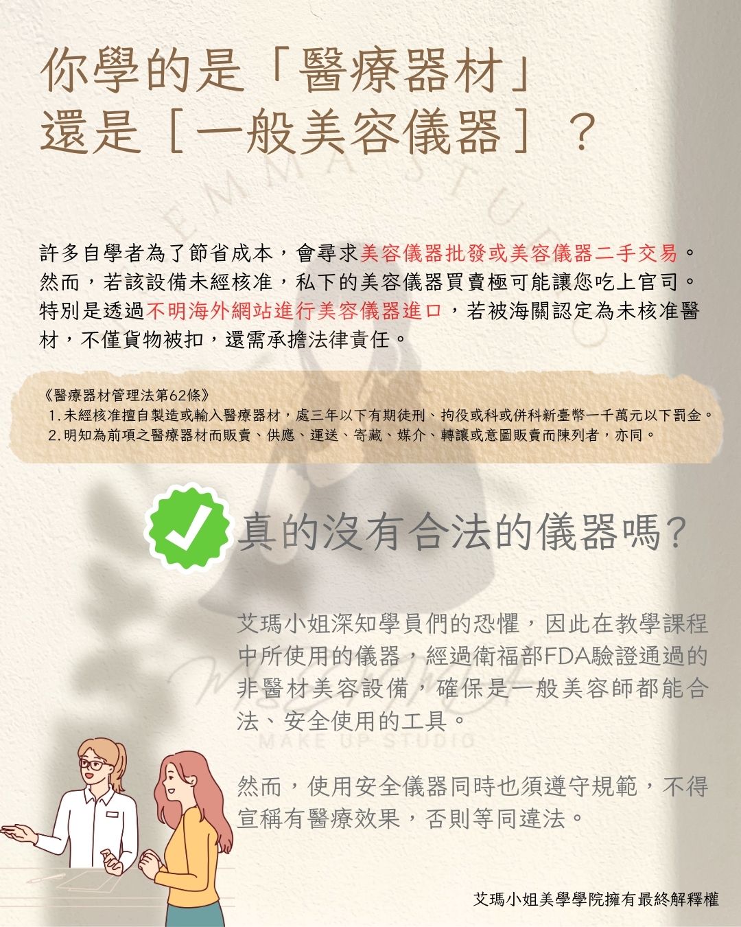 艾瑪小姐深知學員們的恐懼,因此在教學課程中所使用的儀器,經過衛福部FDA驗證通過的非醫材美容設備,確保是一般美容師都能合法、安全使用的工具。